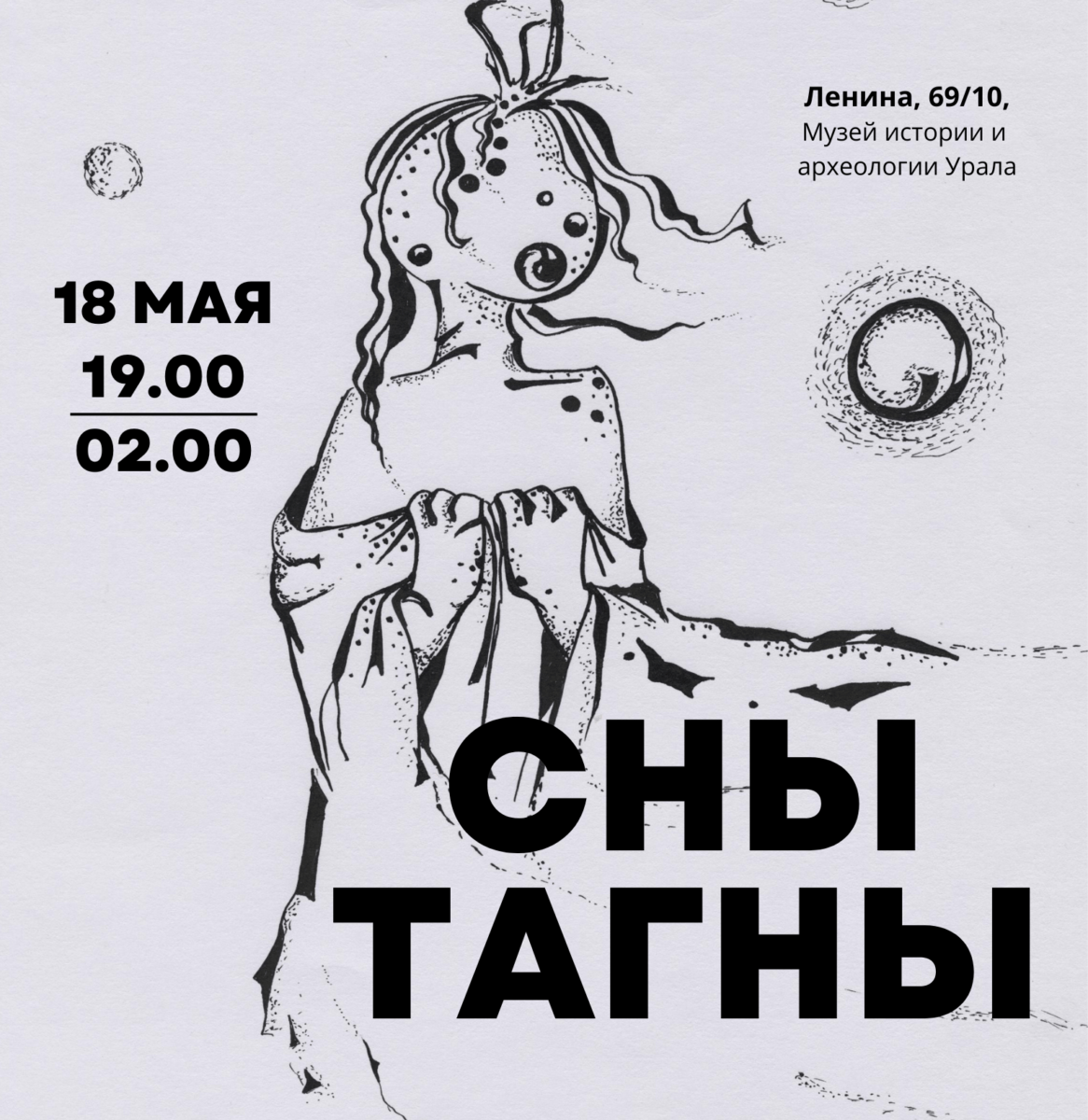 Старт проекта посвящен культуре Ямало-Ненецкого региона, расположенного на Крайнем Севере Урала. Выставка «Сны Тагны» – пролог фестиваля. Впервые будет представлена оригинальная сюрреалистическая графика художницы из Салехарда Тагны Романовой, потомка древнего шаманского рода, и видео-арт по ямало-ненецким фольклорным мотивам актуальных художников Анатолия Пивоварова и арт-группировки «САД».
