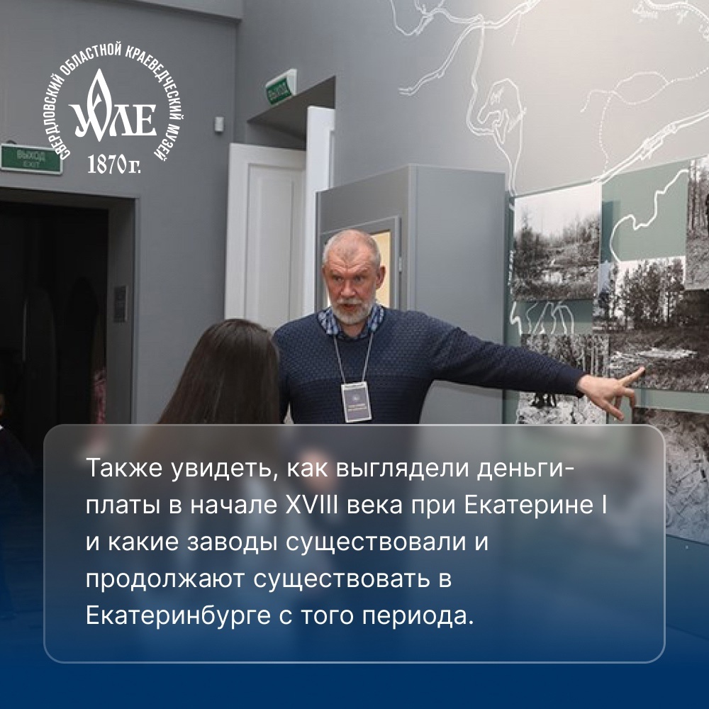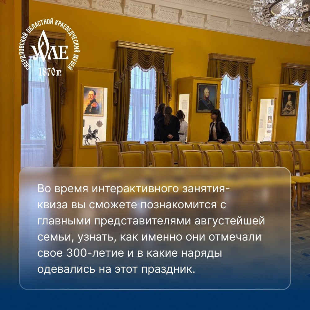 Во время интерактивного занятия-квиза вы сможете познакомится с главными представителями августейшей семьи, узнать, как именно они отмечали свое 300-летие и в какие наряды одевались на этот праздник. Также увидеть, как выглядели деньги-платы в начале XVIII века при Екатерине I и какие заводы существовали и продолжают существовать в Екатеринбурге с того периода.