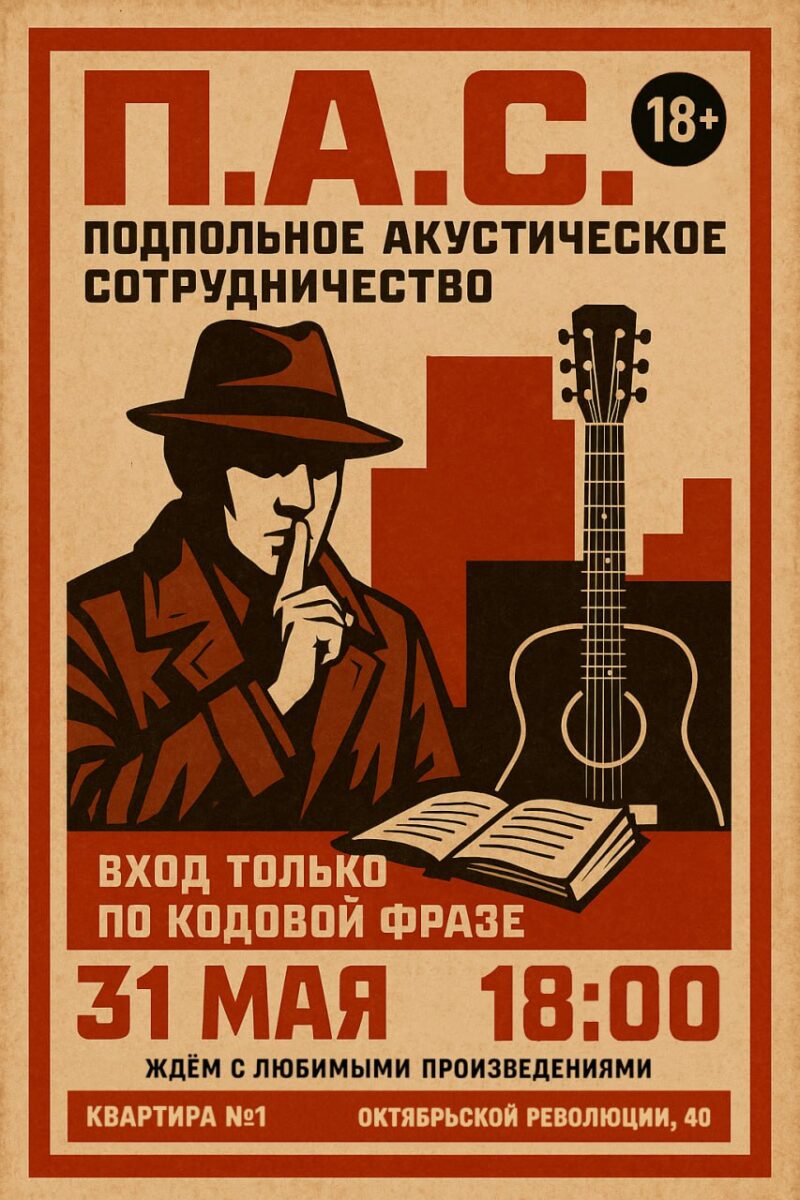 В узком кругу, в закрытом уютном пространстве мы соберёмся на секретный квартирник. Вас ждёт живое исполнение песен под гитару и проникновенное чтение стихов, которые тронут сердце и заставят вспомнить лучшие моменты советской эпохи. Сотрудники подготовили небольшую программу, а после у каждого будет возможность выступить в рамках свободного микрофона.