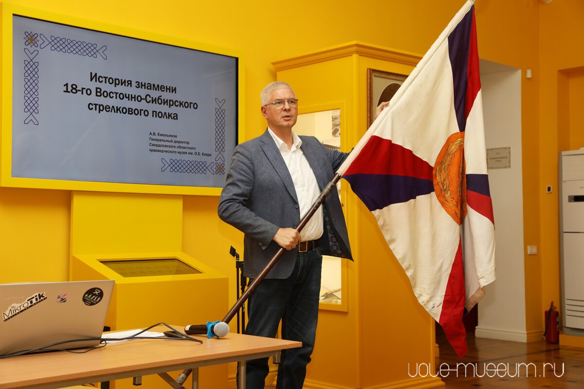 Генеральный директор Свердловского областного краеведческого музея, член Общественной палаты Свердловской области, председатель Регионального отделения «Российское военно-историческое общество» Александр Вячеславович Емельянов поделился уникальными историческими фактами о знамени 18-го Восточно-Сибирского стрелкового полка. Он провел атрибуцию знамени, подробно рассказав о его судьбе и испытаниях, которым оно подвергалось — от Маньчжурии до Екатеринбурга.