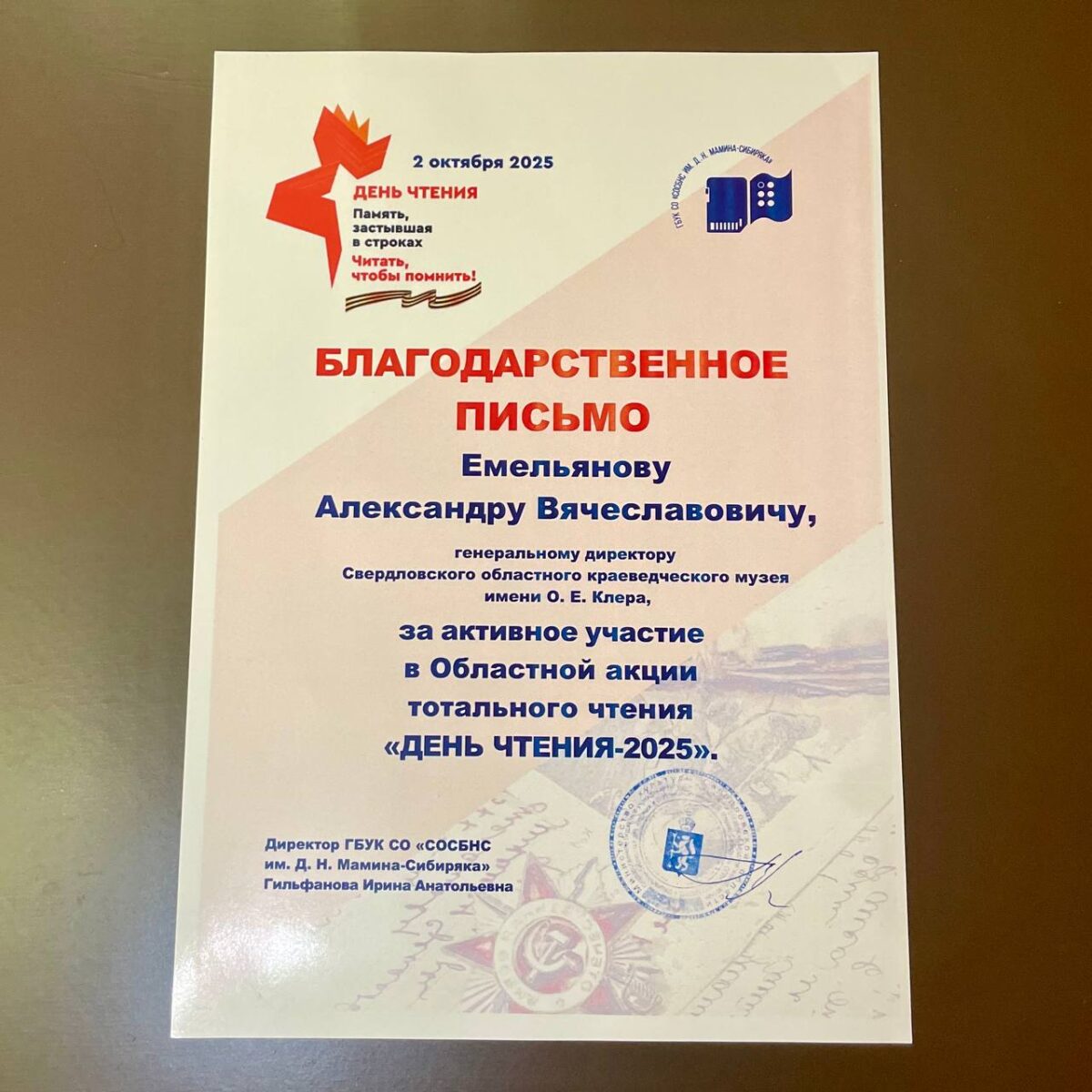 В знак благодарности за содействие в организации акции «День чтения» Свердловская областная специальная библиотека для незрячих и слабовидящих имени Д.Н. Мамина-Сибиряка вручила генеральному директору Свердловского областного краеведческого музея Александру Емельянову благодарственное письмо.