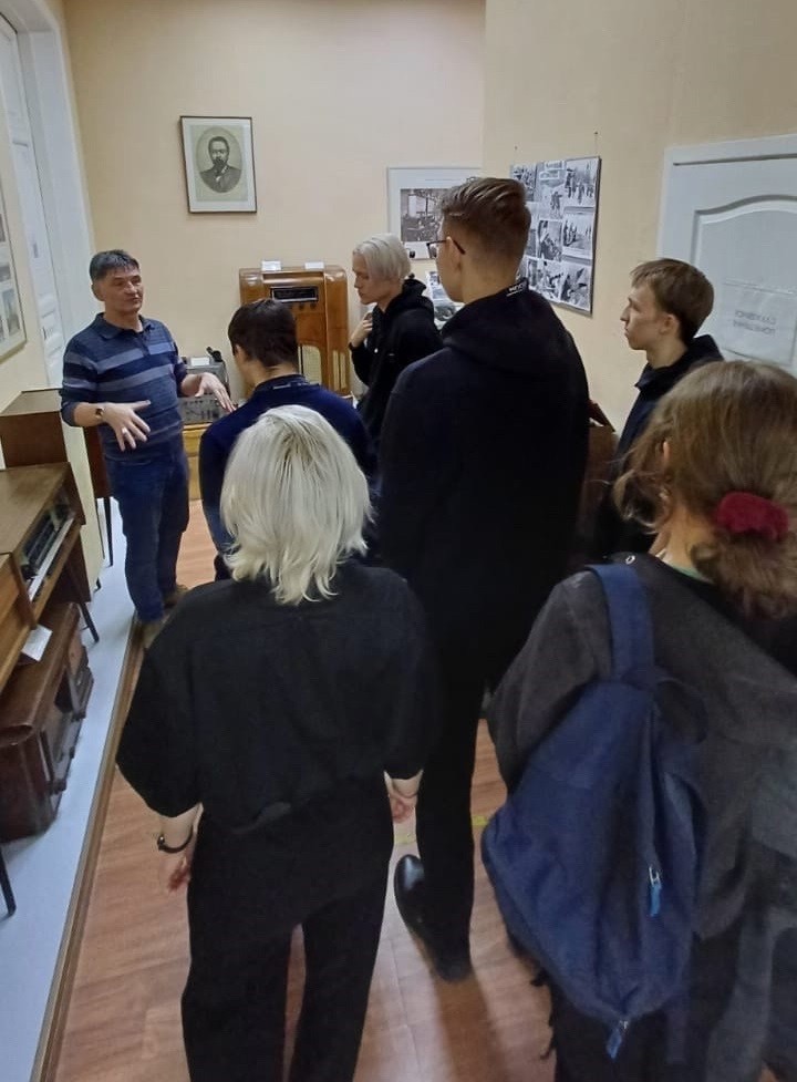 Лекцию-экскурсию по постоянной экспозиции музея провел старший научный сотрудник Вячеслав Богданов. Ребята с интересом узнавали о личности и научных достижениях великого русского ученого, изобретателя радио Александра Степановича Попова. После лекции студенты смогли задать вопросы, чтобы глубже понять историю радио и его значение для современной науки и техники.