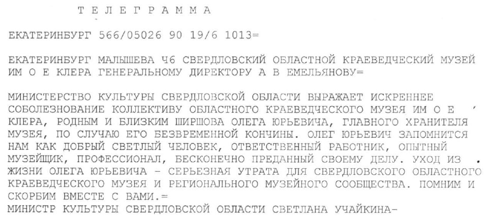19 июня безвременно, после продолжительной болезни, ушел из жизни главный хранитель Свердловского областного краеведческого музея Олег Юрьевич Ширшов.