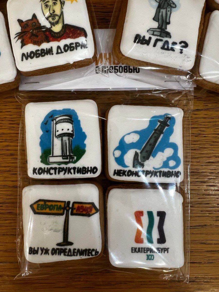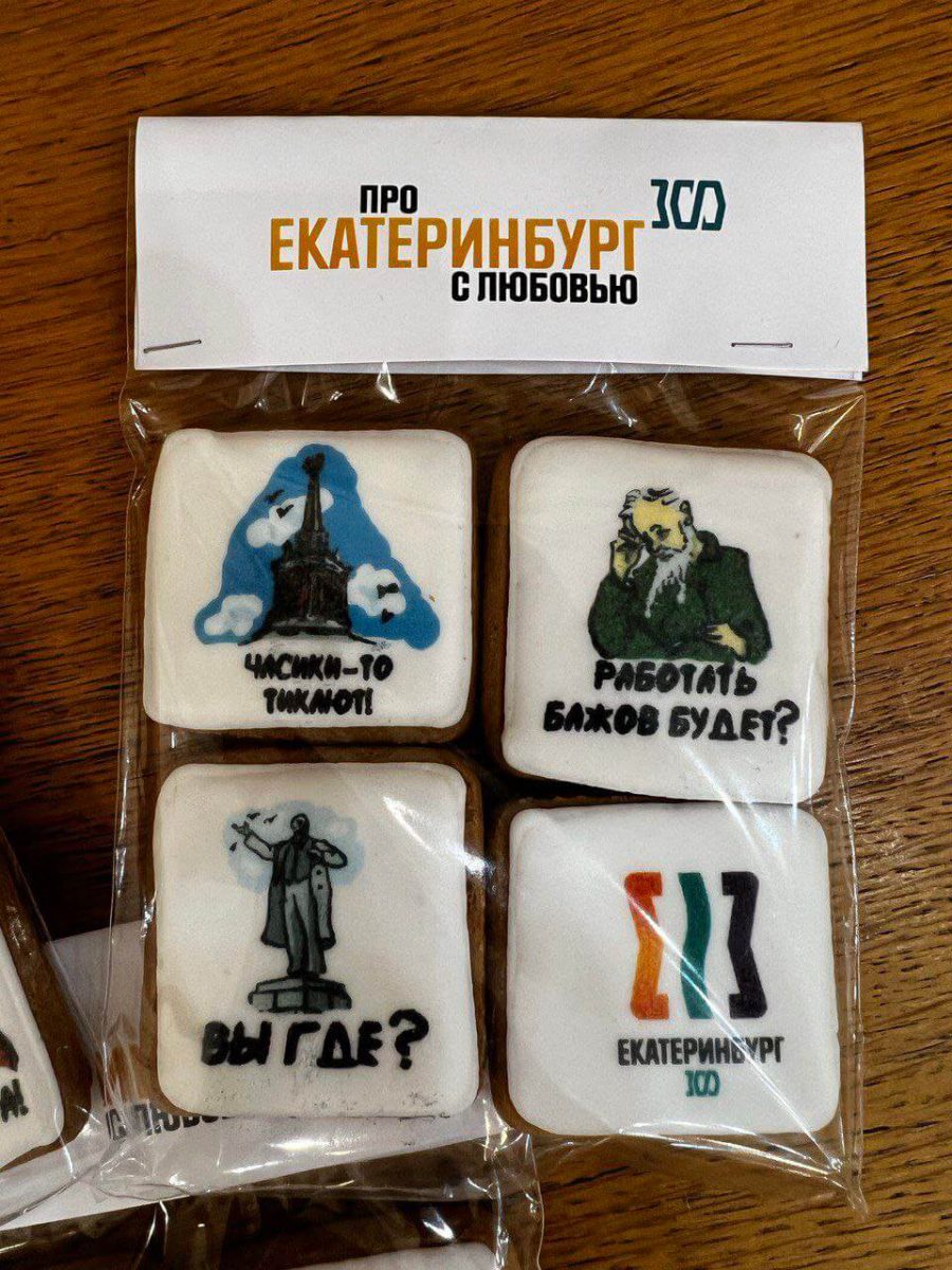 ?️ наборы мини-пряников (по 4 штуки) с авторскими стикерами художницы Екатерины Калужниковой: Шигирским идолом, Николаем Колядой, Павлом Бажовым, цирком, памятником В. И. Ленину, башней мэрии и еще 10 образами.