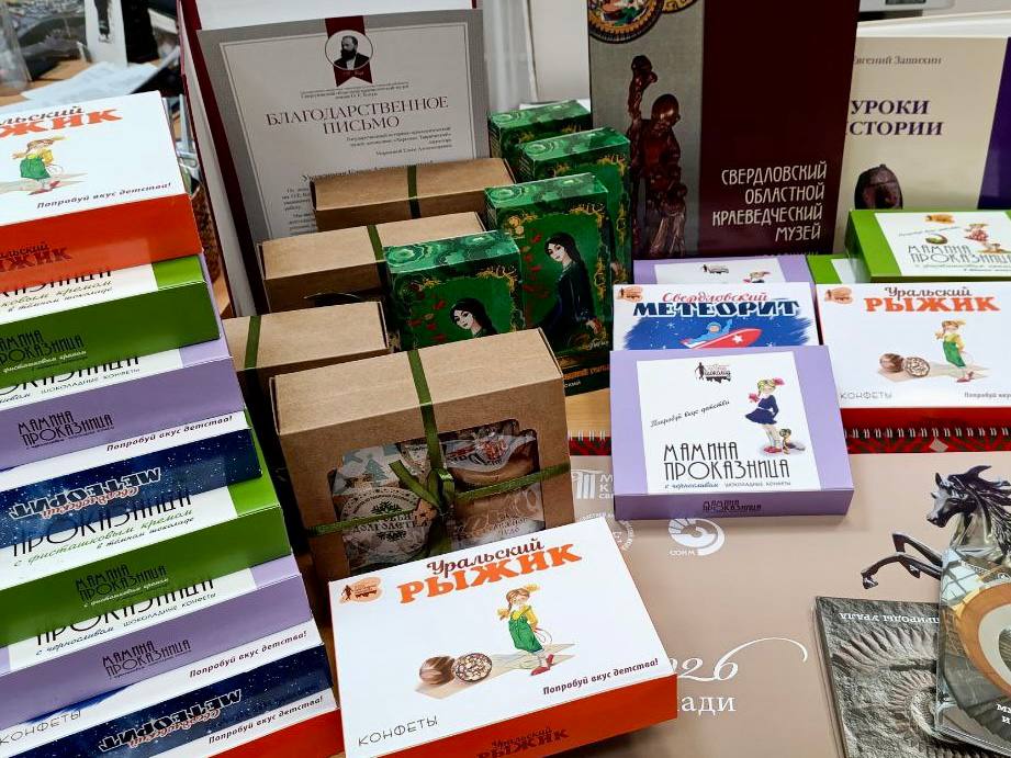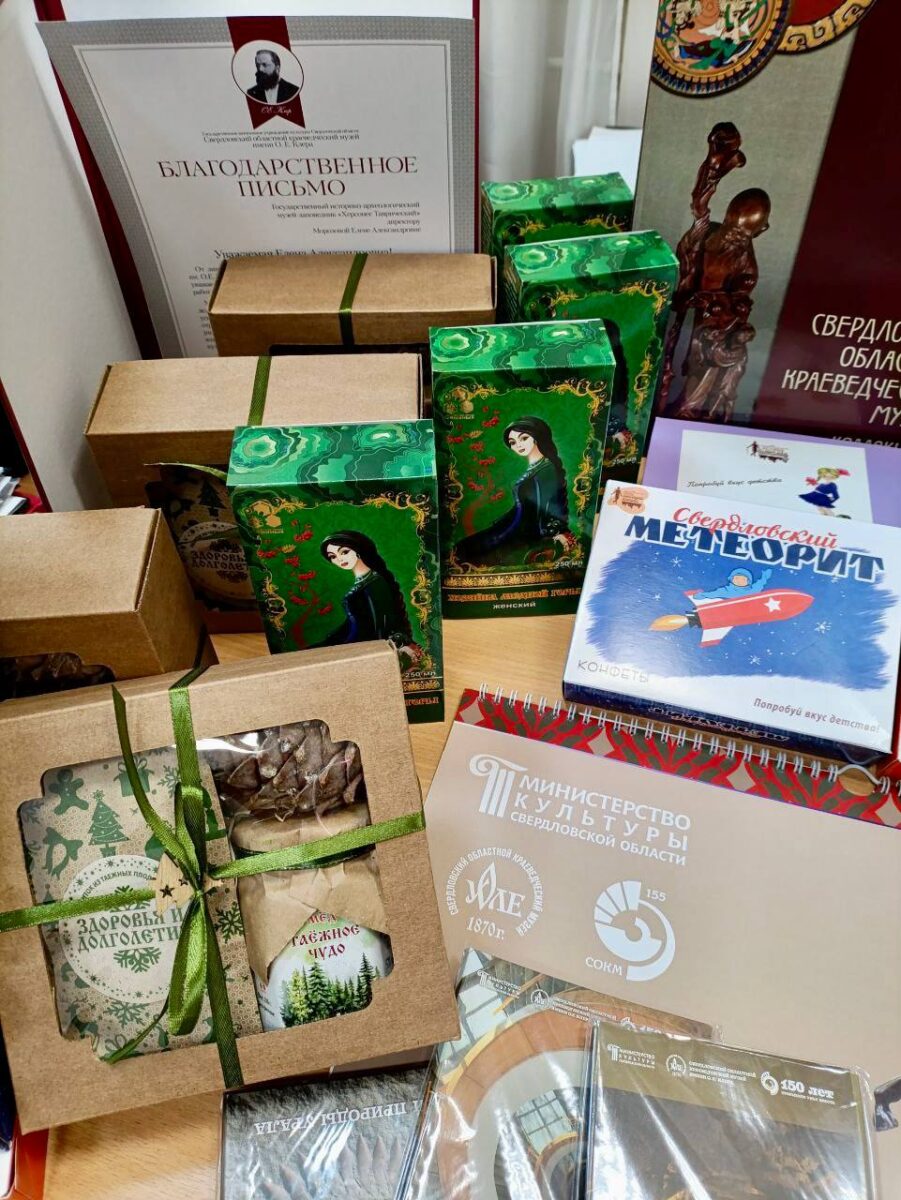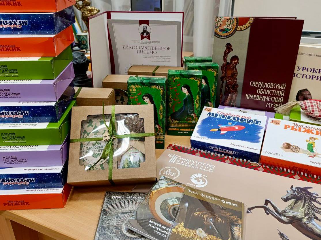 Свердловский областной краеведческий музей подготовил уральские подарки для коллег из Республики Крым, Донецкой и Луганской Народных Республик: каталоги коллекции Свердловского областного краеведческого музея, сувениры с Хозяйкой Медной горы, конфеты Свердловских кондитерских фабрик и многое другое.