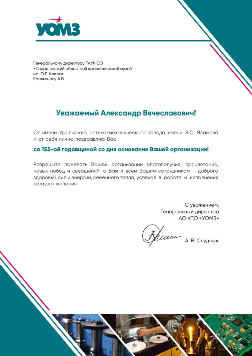 Благодарим Уральский оптико-механический завод имени Э.С. Яламова и генерального директора АО «ПО «УОМЗ» Анатолия Владимировича Слудных за теплые поздравления с юбилеем.
