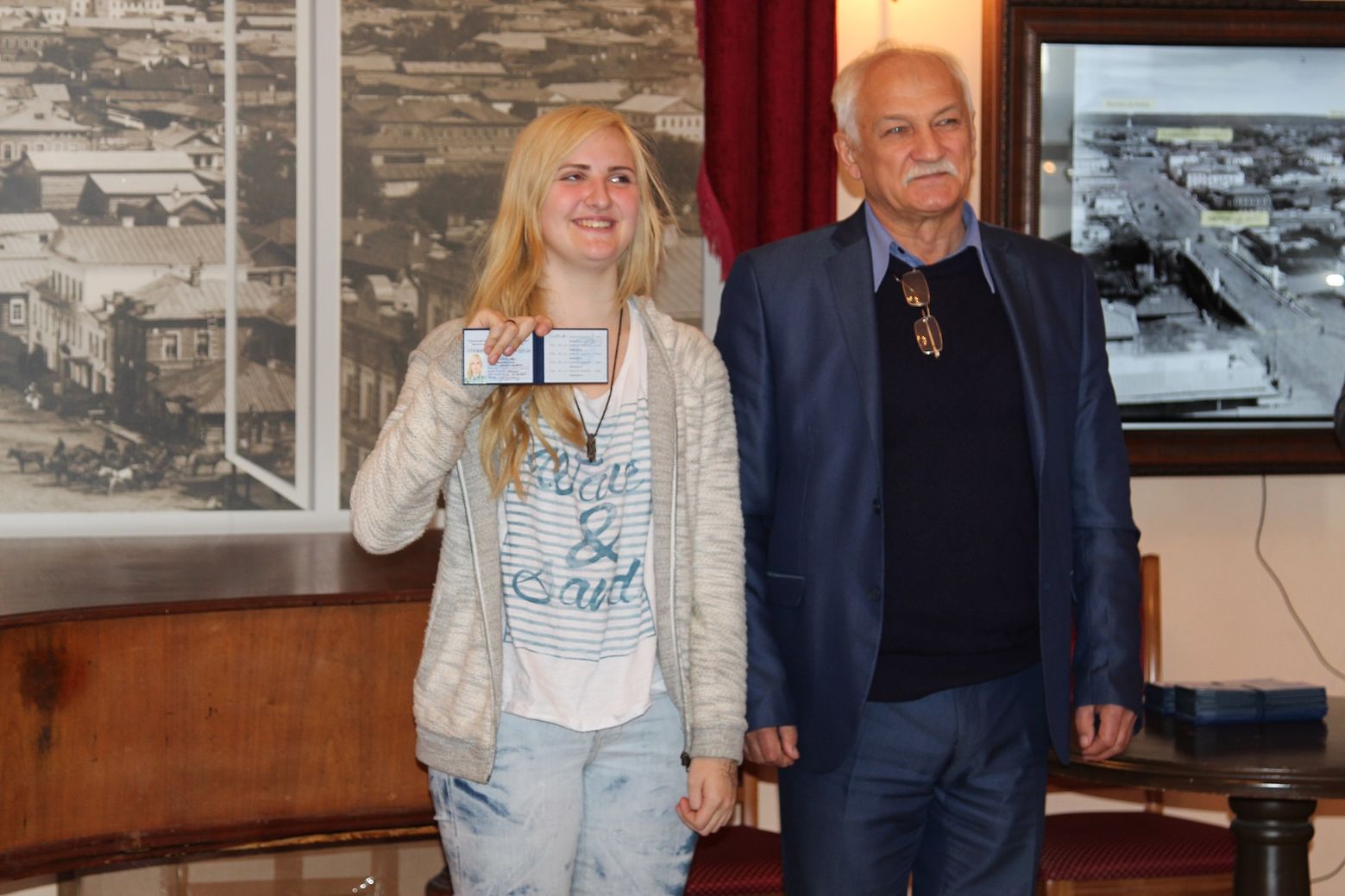 Роскошная гостиная особняка дворян Поклевских стала местом проведения торжественной церемонии вручения студенческих билетов. Руководители вуза выступили с напутственными словами будущим профессионалам туристской отрасли и затем приступили к самой волнительной для учащихся процедуре.
