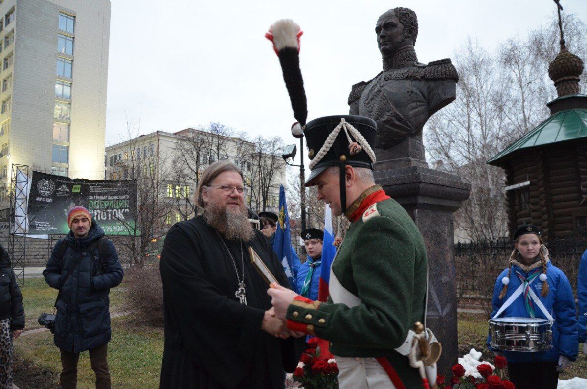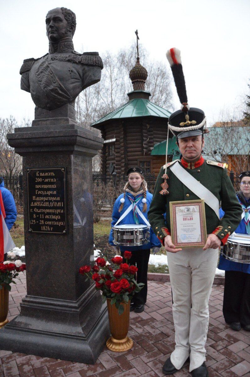 Затем состоялось торжественное построение с возложением цветов к памятнику Государю Императору Александру I, в котором приняли участие представители Екатеринбургского отделения Императорского православного палестинского общества, регионального отделения Российского военно-исторического общества, Братства православных следопытов, городского дворца творчества детей и молодежи и общественности Екатеринбурга, а также сотрудники Свердловского областного краеведческого музея — генеральный директор Александр Емельянов и научный сотрудник Дмитрий Карпов.