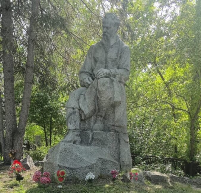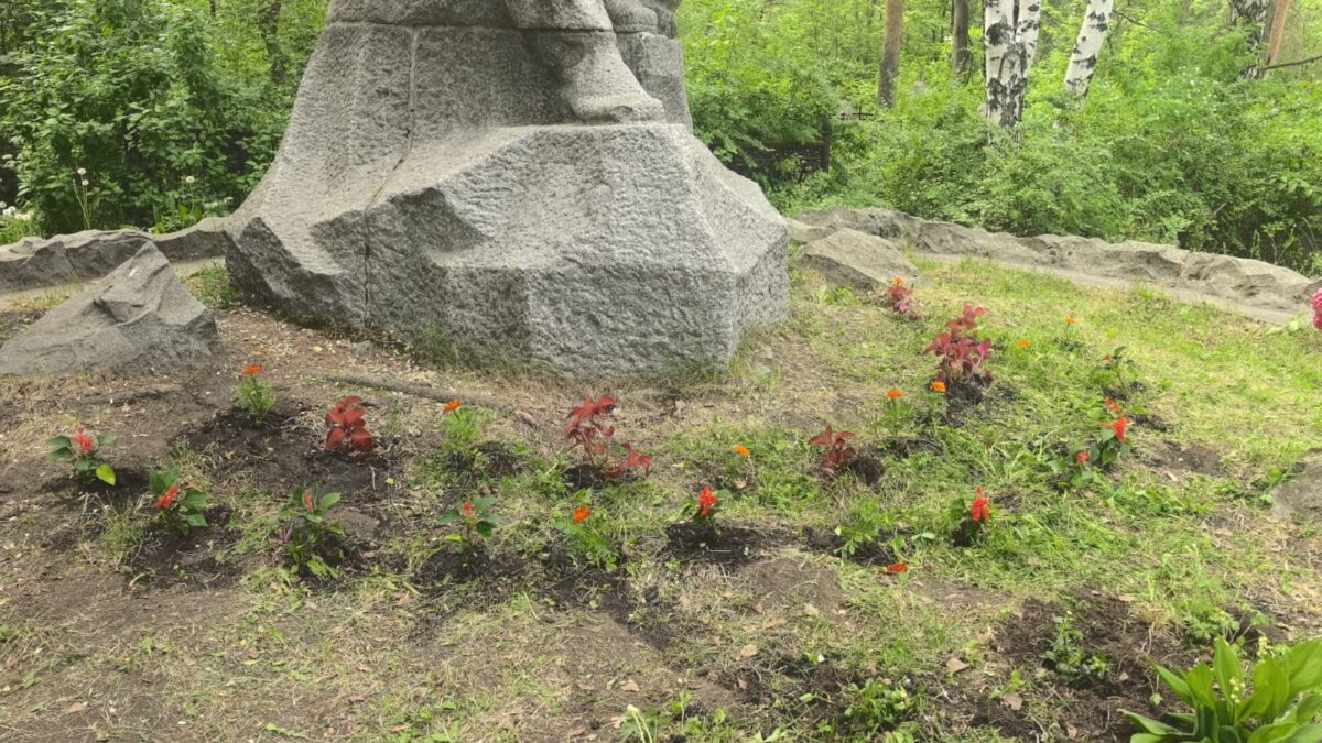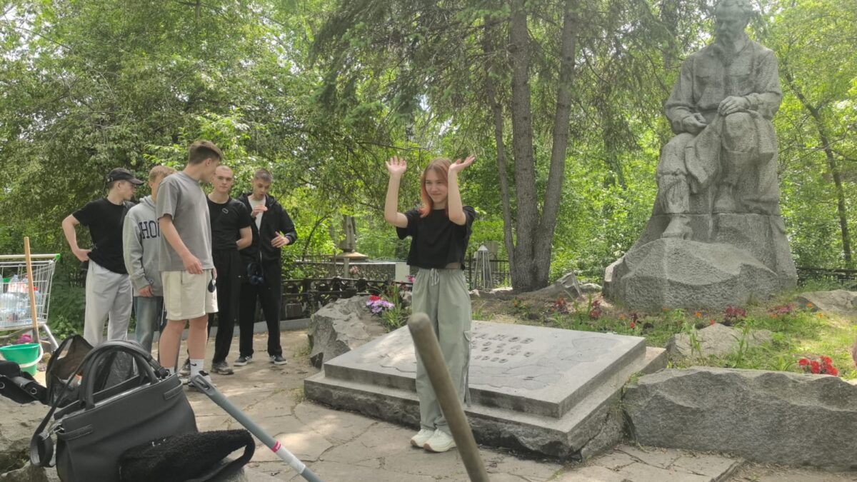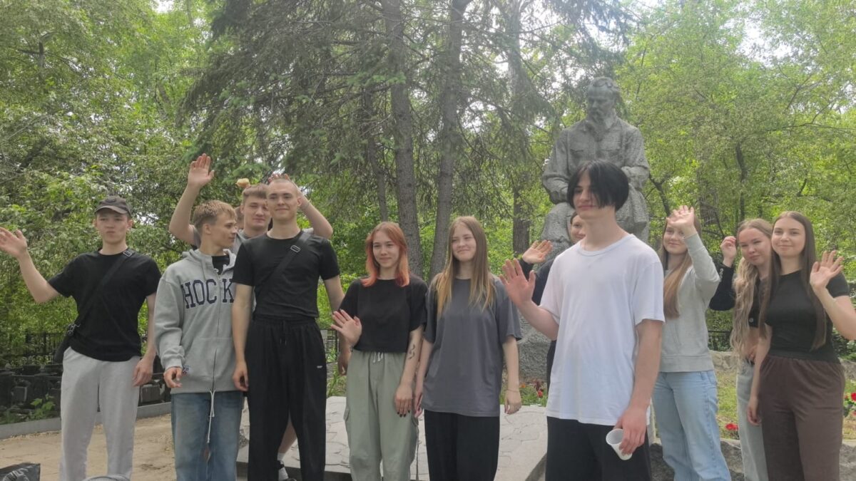 Субботник на Ивановском кладбище: студенты Екатеринбургского политехникума вымыли памятник Бажову и посадили цветы вокруг скульптуры выдающегося уральца