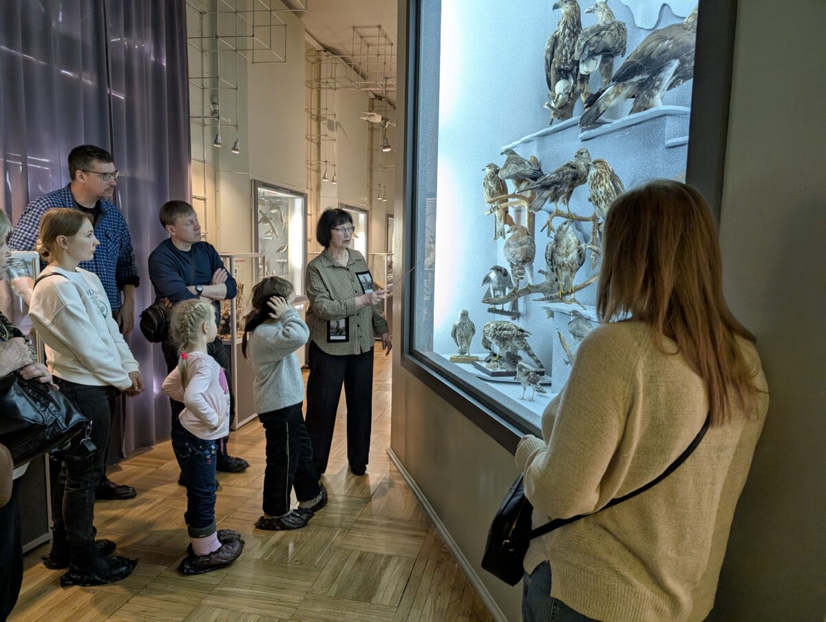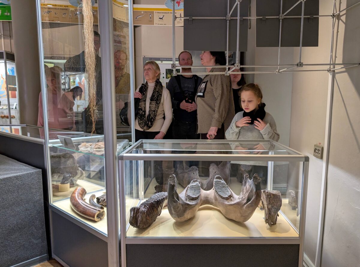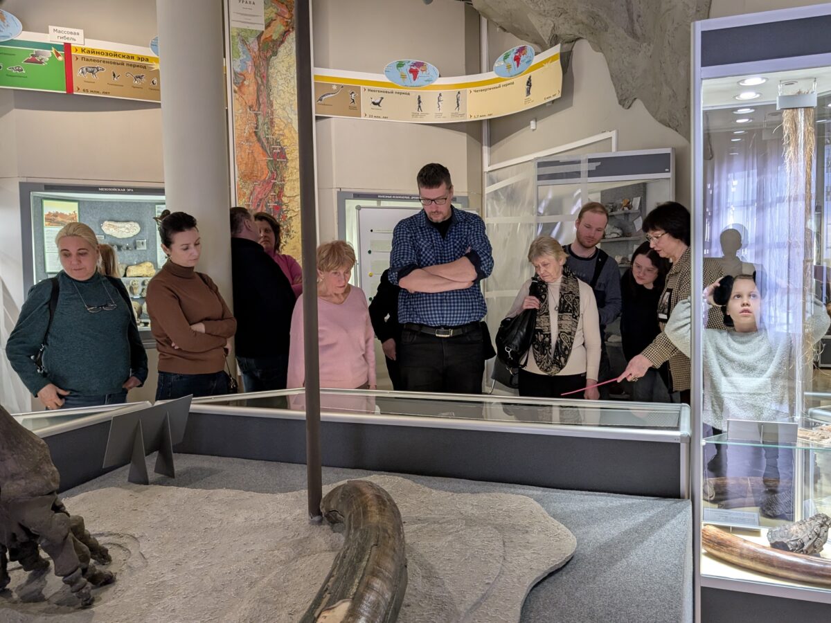 Вторая часть встречи прошла в залах музея, участники смогли посмотреть на предметы, поступившие в собрание именно из коллекции УОЛЕ. Гости узнали историю находки скелетов широкорогого оленя и шерстистого мамонта, увидели старейшие таксидермические скульптуры музея — самку бурого медведя и самца лося, изготовленные в 1887 году. Разговор коснулся и Сибирско-Уральской промышленной выставки 1887 года, а также тех сложностей, с которыми сталкиваются сотрудники естественно-научных музеев при создании современных экспозиций.