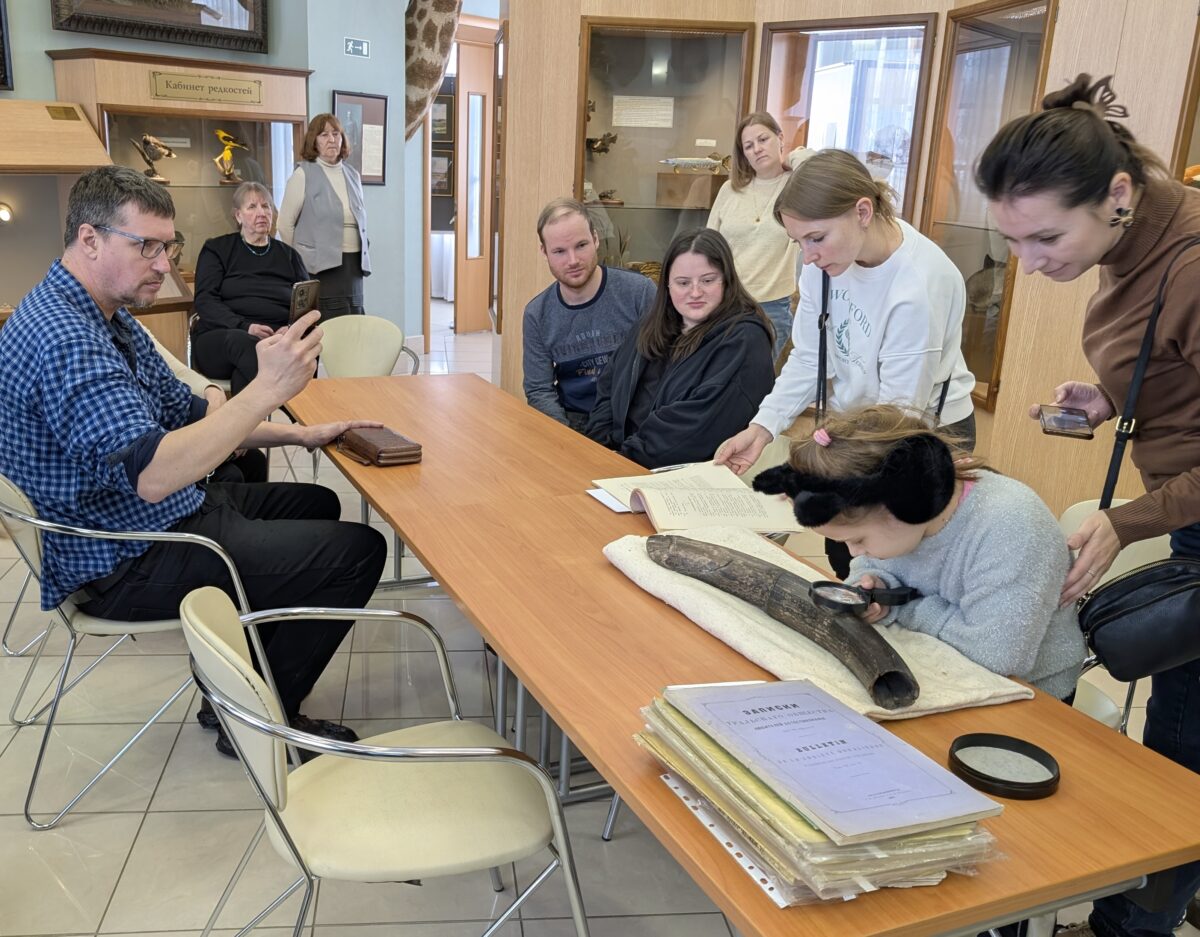 Лекцию прочла заведующая Музеем природы Урала Елена Сергеевна Скурыхина. Слушатели погрузились в историю легендарного общества, узнали о его основателе Онисиме Егоровиче Клере и о том, какую роль УОЛЕ играло в общественной и научной жизни Екатеринбурга на рубеже XIX–XX веков. Особый интерес вызвала возможность увидеть первые выпуски «Записок УОЛЕ», изданные вскоре после создания общества. Главным «экспонатом» лекции стал бивень мамонта из старейших фондов УОЛЕ, на котором сохранилась подлинная этикетка 1897 года — её участники рассматривали буквально с лупой, настолько мелким и изящным был дореволюционный шрифт.