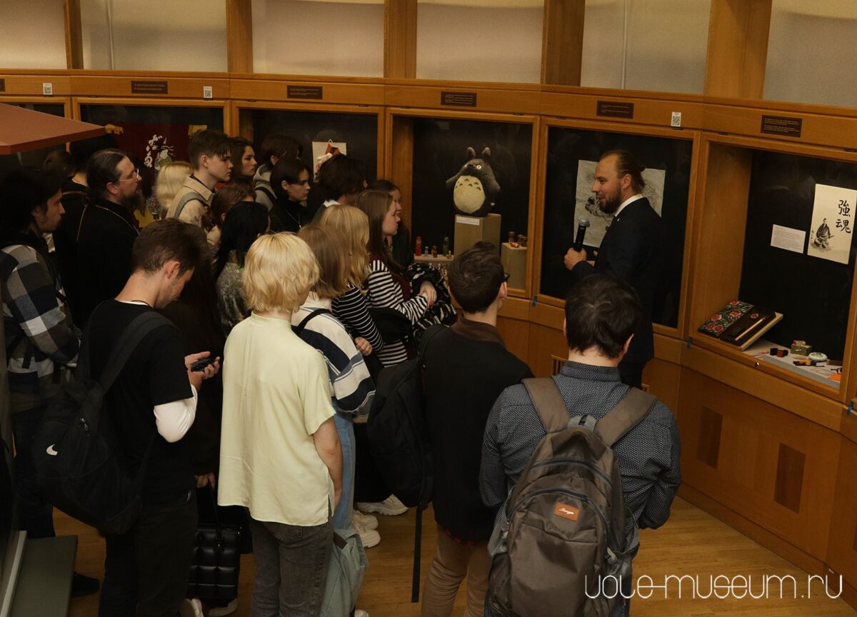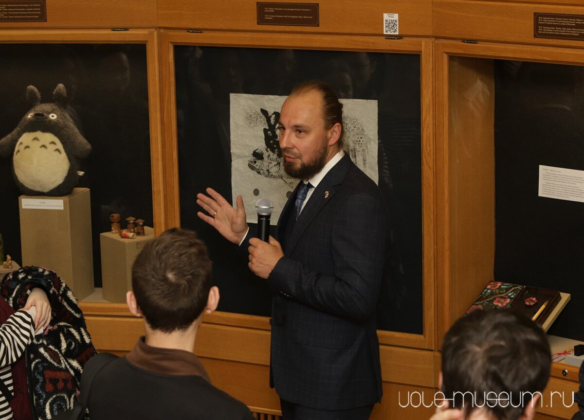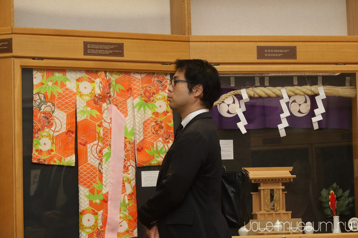 Первую экскурсию по выставке провел Вадим Занин, председатель Свердловского областного отделения всероссийского Общества «Россия – Япония». Он рассказал историю создания экспозиции: большую часть экспонатов подарили простые жители Японии, ранее эти предметы быта, вышивки, подарки хранились в их семьях.