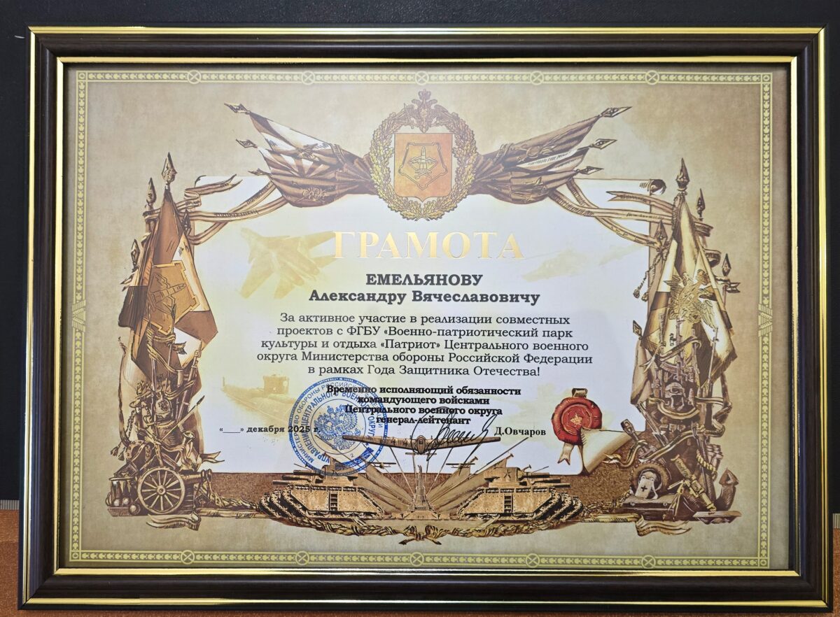 Генеральный директор Свердловского областного краеведческого музея Александр Вячеславович Емельянов удостоен почётной грамоты за активное участие в реализации совместных проектов с ФГБУ «Военно-патриотический парк культуры и отдыха „Патриот“» Центрального военного округа Министерства обороны Российской Федерации.